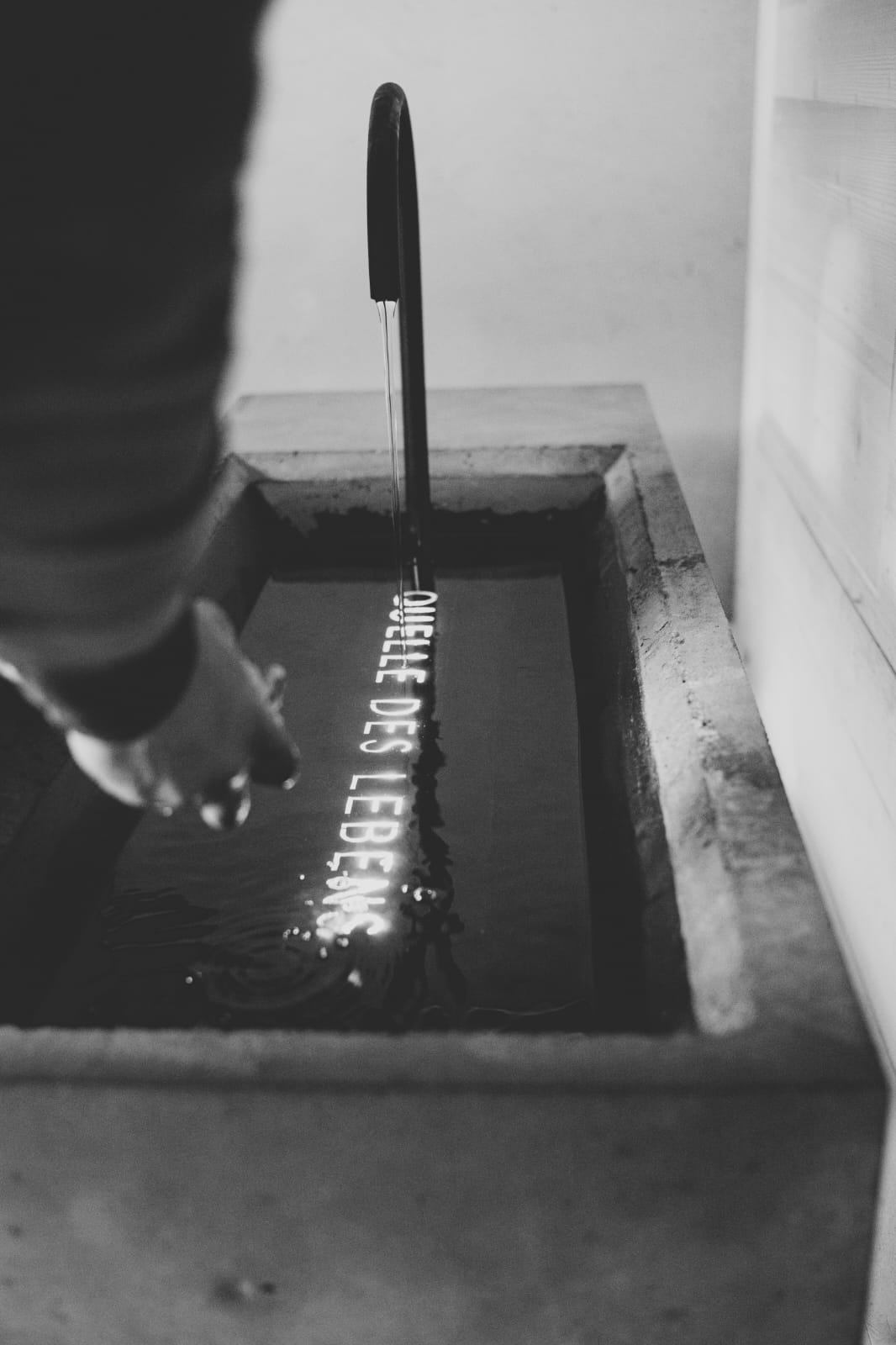 Ein zentrales Element ist die eingearbeitete Schrift im Inneren des Beckens, die durch eine integrierte Beleuchtung sichtbar wird.
