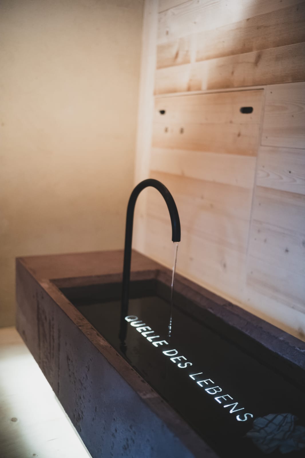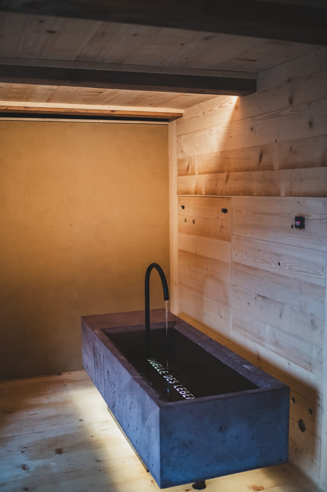 Im Zusammenspiel mit dem fließenden Wasser entsteht eine ruhige, atmosphärische Wirkung, die dem Raum eine besondere Stimmung verleiht.