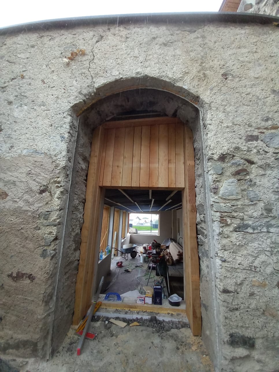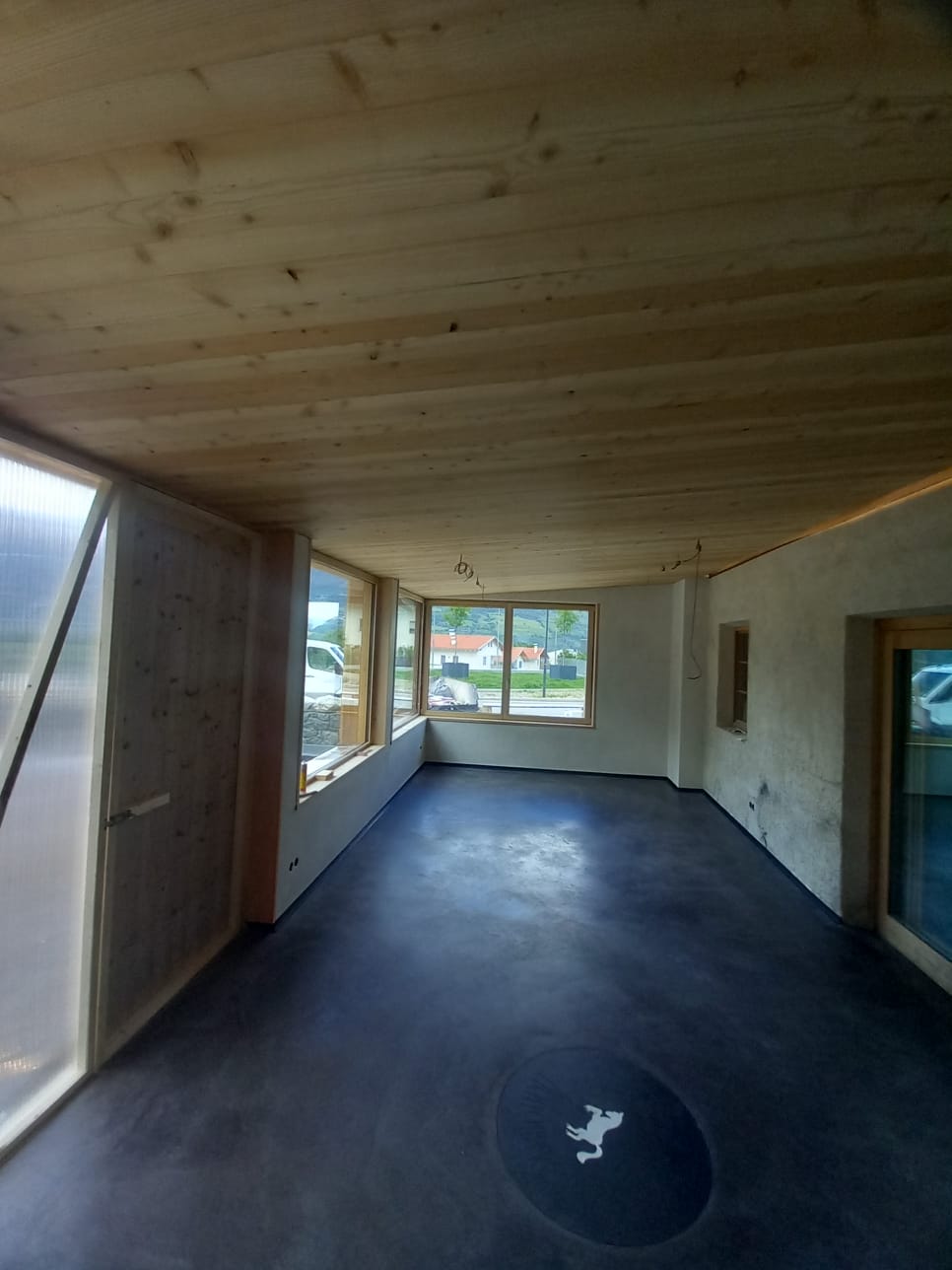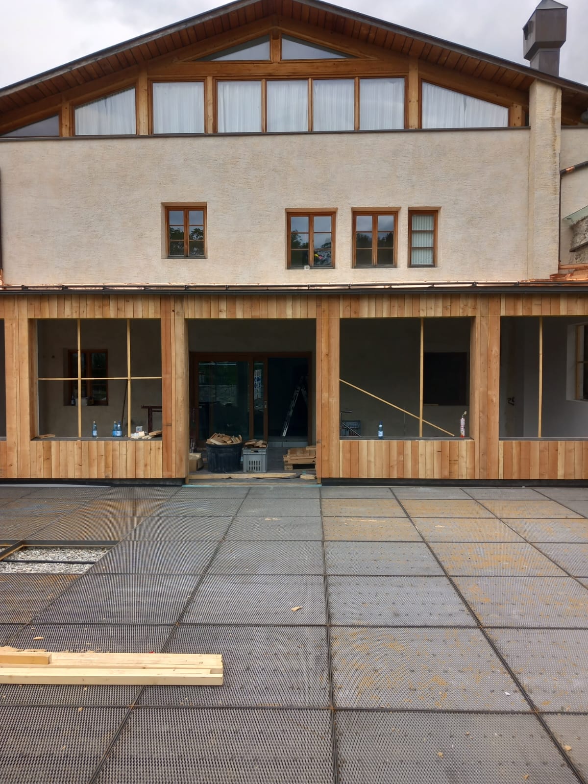 Dazu gehören Böden (fugenloser Schwarzzementboden), Sanierung der Dachkonstruktionen, Verkleidung der Aussenfassade mit einheimischer Lärche sowie die Decke aus einheimischer Lärche, Verputz der Wände mit Kalkglätte und Erweiterung der Küche.